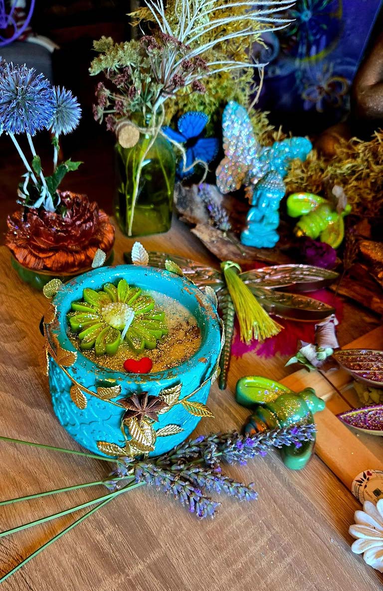 Chaque bougie et chaque décoration naissent d’un savoir-faire artisanal où la nature et la magie se rencontrent. Coulées avec une cire végétale pure et imprégnées d’huiles essentielles aux notes subtiles, les bougies libèrent une aura douce et bienveillante, invitant à la sérénité et à l’équilibre intérieur.