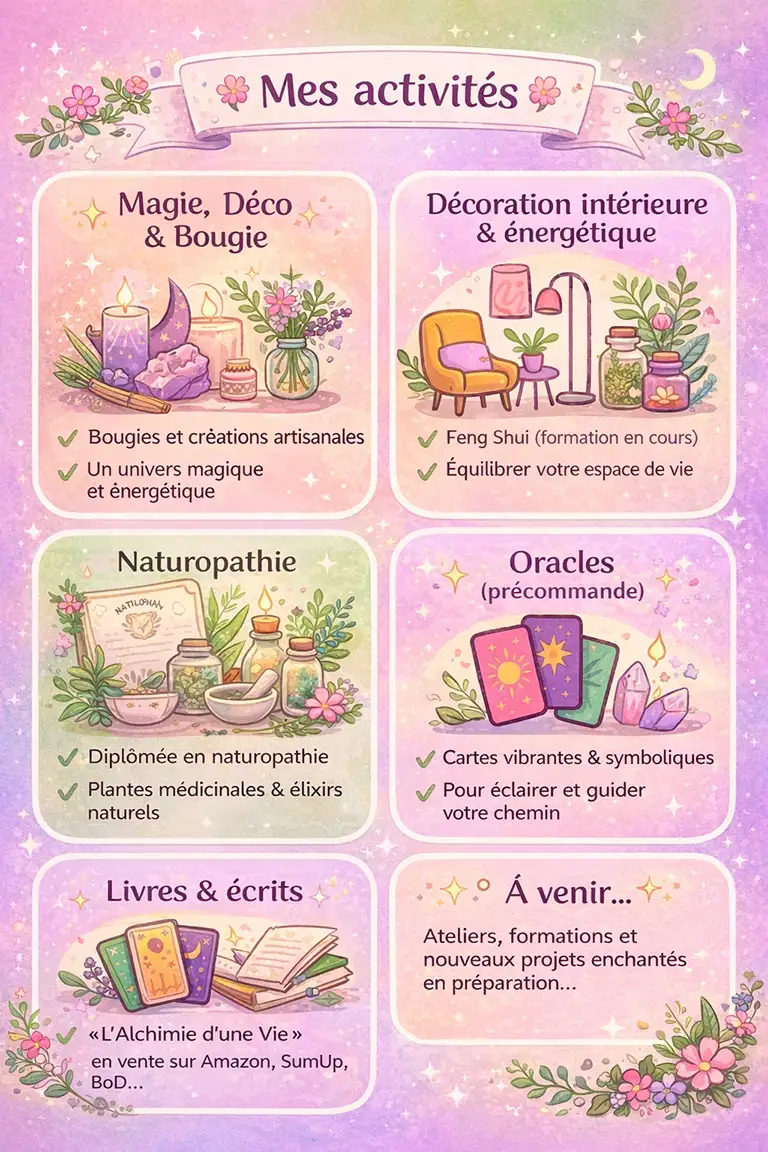 Je vous propose une variété d'activités : création de bougies artisanales et naturelles, conseils en décoration intérieure. Participez à des rencontres magiques et laissez-vous inspirer par des créations uniques. Rejoignez-moi pour vivre des moments inoubliables.
